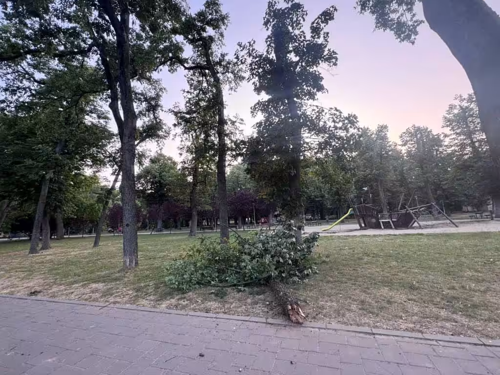 Ieri, 11 iunie, în același parc, o creangă zdravănă a căzut la doar câțiva metri de locul de joacă. De ce? A bătut un pic vântul. Nu o furtună, nu o vijelie. Un vânt obișnuit. Dacă era un copil acolo? Un părinte? Un bebeluș în cărucior?