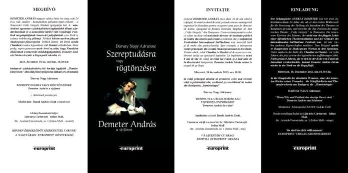 „Respectul celor scrise sau uşurinţa exprimării”este o carte biografică, scrisă în limba maghiară de Darvay Nagy Adrienne, care surprinde în principal implicarea actorului Demeter Andras în viaţa culturală din Timişoara. La doar 24 de ani a câştigat primul concurs managerial organizat acum două decenii, în România. El a obţinut postul de director de teatru, ajungând în fruntea Teatrului Maghiar de Stat „Csiky Gergely” din Timişoara. Andras este, de asemenea, iniţiatorul Festivalului Internaţional SalTimBan, precum şi interpretul unor roluri principale ale operelor „shakespeare-iene” în trei limbi.Printre altele, rolul Claudius în Hamlet-ul de acum zece ani, devenit astăzi un spectacol legendar. La împlinirea a exact 8 ani de zile de când, în rolul lui Faust, şi-a luat adio de la directoratul timişorean, Demeter András István revine în oraşul de pe Bega.