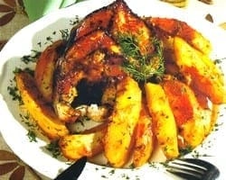 Se scoate tava din cuptor dupa 20 minute, apoi se toarna bulionul dizolvat in 150 ml apa si se presara sare dupa gust. Se coace preparatul inca 15 minute. Se serveste pestele pe cartofi, presarat cu marar si patrunjel tocat marunt.