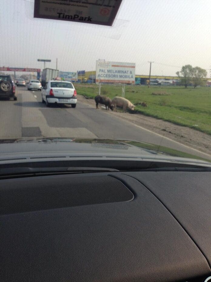 Imaginea care m-a făcut să-mi „dau cu părerea” datează de astăzi, şi este cea în care apar doi porci (animalele cu patru picioare care se regăsesc de obicei în cocina de la bunica, de la sat) care pasc nestingheriţi la marginea aceleiaşi şosele – Calea Şagului, şi a fost postată de un cunoscut personaj din Timişoara, a cărui nume prefer să nu-l fac public pentru că omul nu are nicio treabă cu ceea ce am scris eu mai sus.